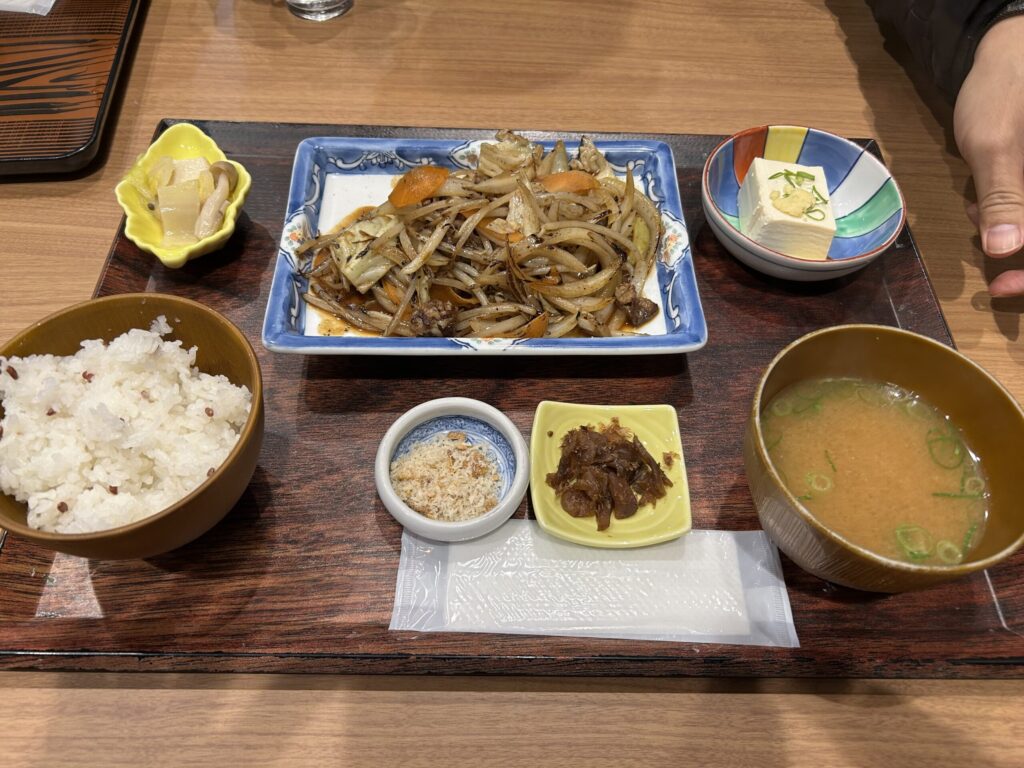 今回の夜ご飯は、楽をして、施設内のラムちゃんパークのレストランで名物のジンギスカン定食を食べました。
